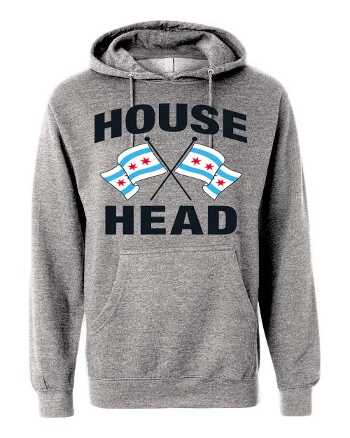 The House Head Chicago light heather grey hoodie is 8.5 oz., 75/25 Cotton/Polyester, 20 Singles with High Quality Print ("Soft-Feel" hoodie).