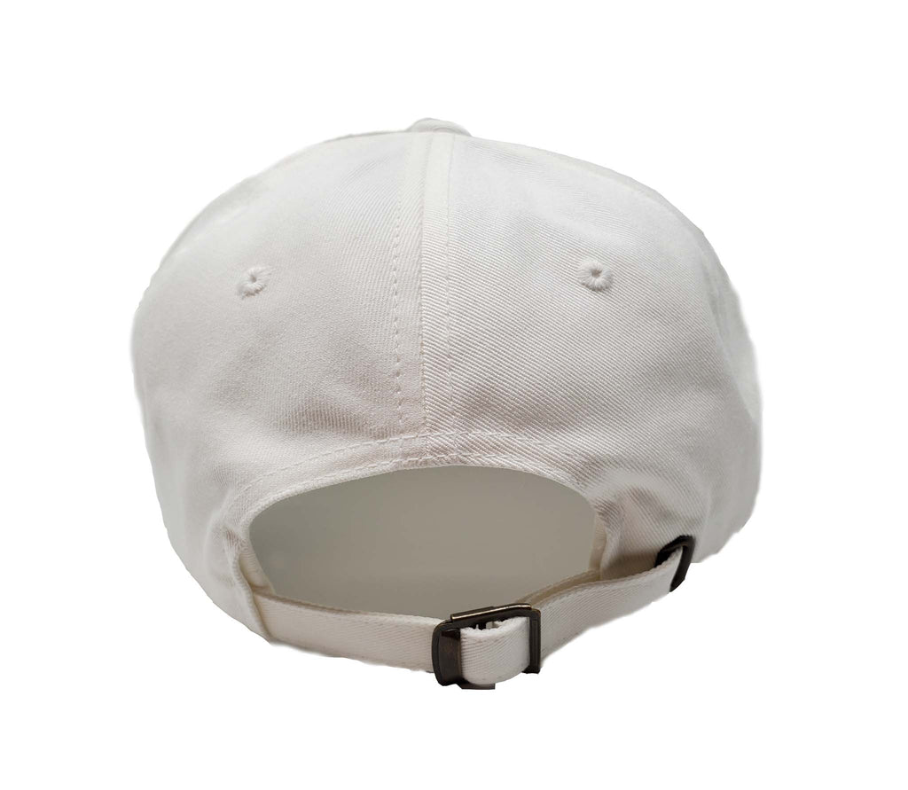 The House Head Pink and White Dad Cap is 100% cotton, chino twill, low profile, 6 panel, 3 1/8" crown with buckle closure with grommet.